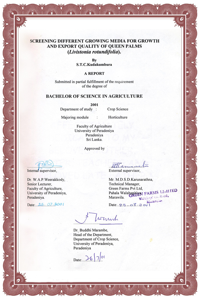 * ⁠B.SC in Agriculture in 2001, Major in Crop Science , Thesis on Coir Growing Media Enhancement, University of Peradeniya.
