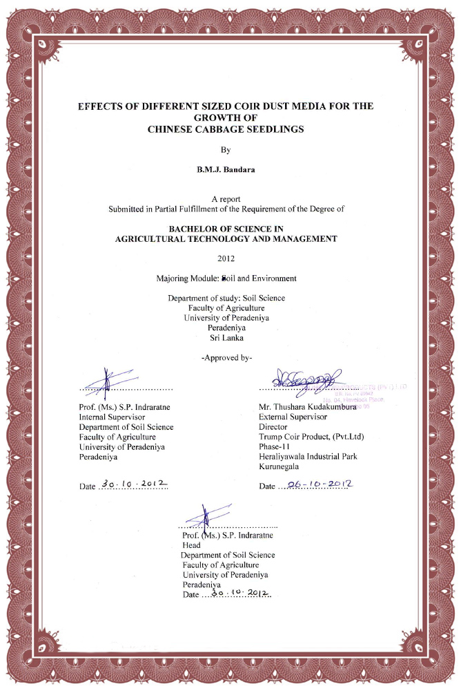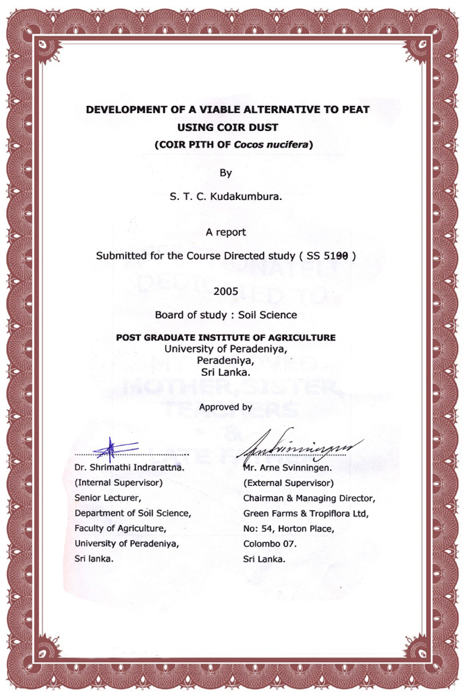 * ⁠M.SC in Environmental Soil Science in 2005 , Thesis on Composted Coir Growing Media Development, University of Peradeniya .